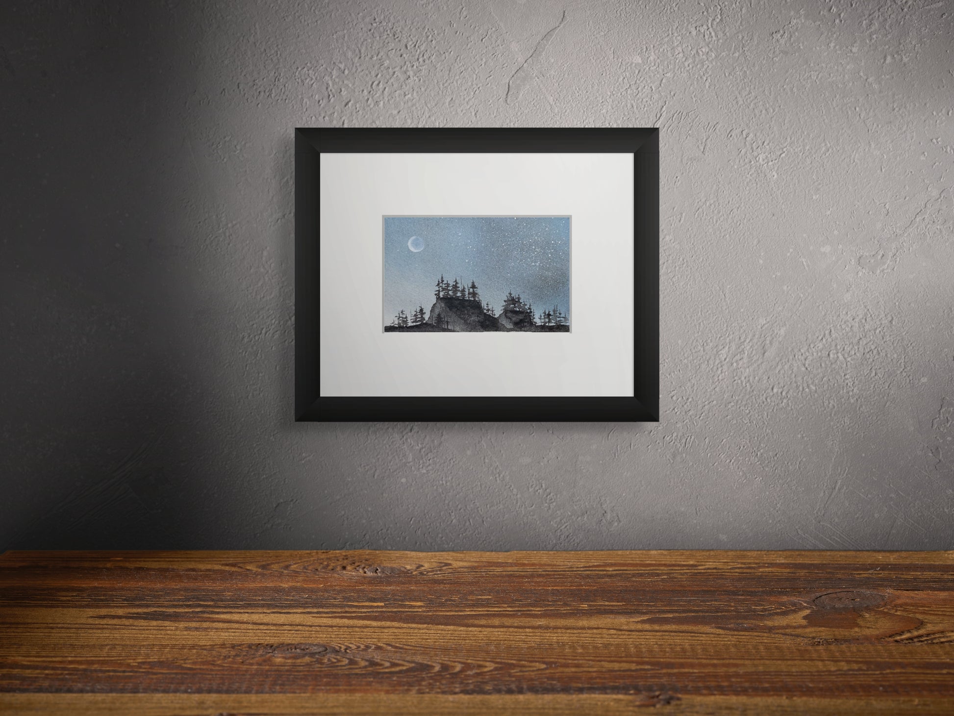 In Moonlit Timber Rise: Original Watercolor by K.L. Rockwell (Matted 8" x 10"), Oregon Coast artist K.L. Rockwell captures the serene beauty of a starlit landscape. The delicate wash of sky, the luminous moon, and the textured rock formations evoke a moment of Pacific stillness, suspended between twilight and darkness. This painting holds the quiet grace of a winter night along the coast, where the land feels timeless and gently illuminated.