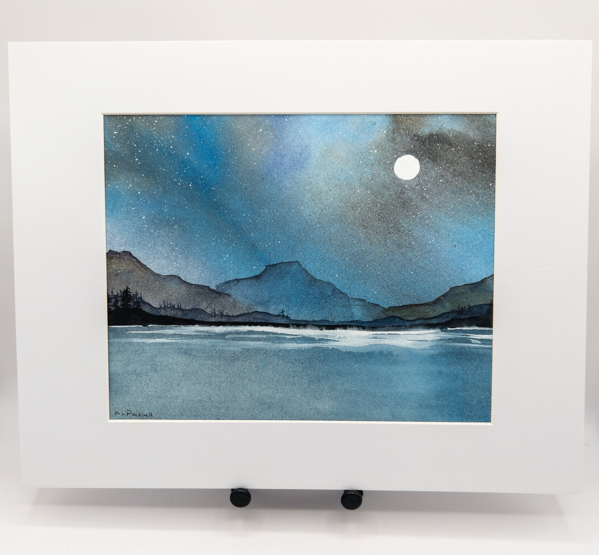 In The Earth Dances, Oregon Coast artist K.L. Rockwell captures the harmony between sky, sea, and mountain — a rare moment when the landscape seems alive in its own rhythm. Subtle gradients of indigo and slate evoke both movement and peace, a dance of elements caught in watercolor and light.