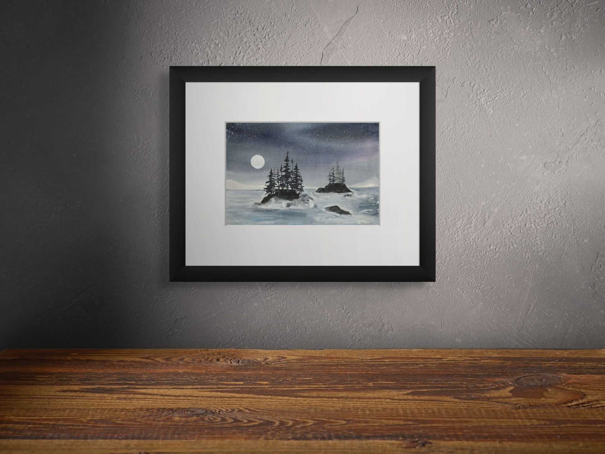 Twin Isles Under Aurora - Original Watercolor by K.L. Rockwell (Matted 11" x 14")